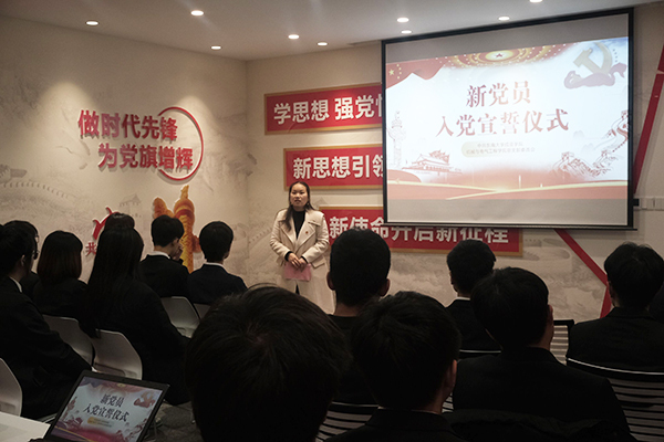 宣誓仪式在庄严的《国歌》中拉开序幕。随后,由邓蓉蓉老师领誓,全体新党员面对鲜红的党旗庄严宣誓,许下为共产主义奋斗终生的誓言。铿锵有力的誓词,表达了对党的无限忠诚和为共产主义奋斗终身的决心和承诺。学生党员代表姚蔡楠、孙禹发言,他们感谢党组织和学院悉心培养的同时,表示将时刻以党员的标准严格要求自己,积极响应党组织号召,发挥先锋模范作用。最后,党总支书记严红霞老师讲话,她强调党员的政治生命将从成为预备党员开启,一定要牢记今天立下的誓言,端正入党动机,牢记全心全意为人民服务的宗旨,在今后的学习工作中,更加严格要求自己,努力成为一名优秀的中国共产党党员。