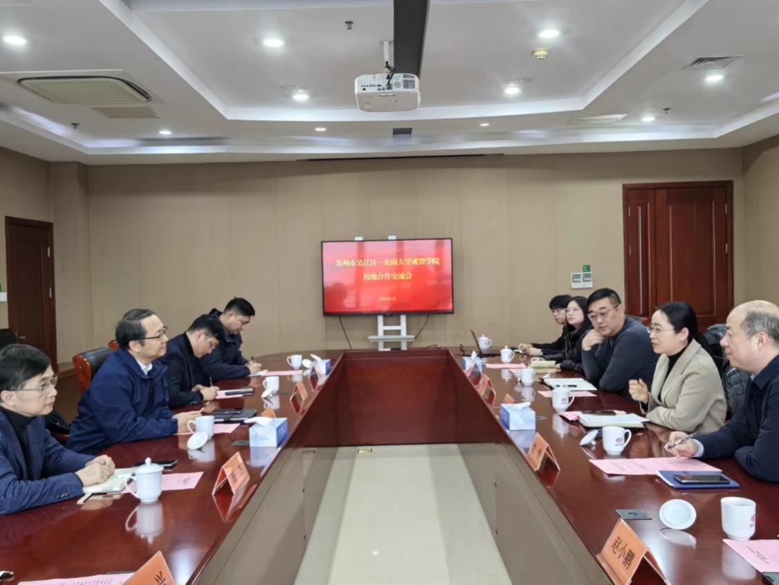王荣副书记介绍近年我校与吴江区人社局开展就业工作概况、考研升学情况和吴江籍学生就业去向,希望双方能够开展更深层次、更全方位、更高质量的交流合作,实现校地校政企发展深度融合,为助推地方经济社会发展做出更大贡献。