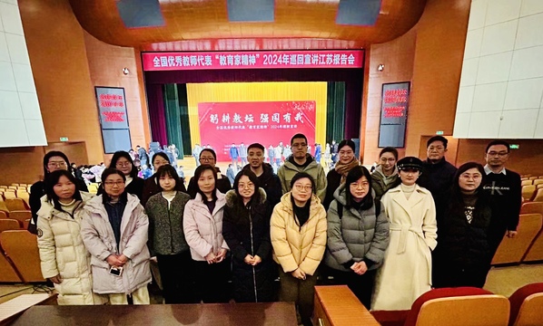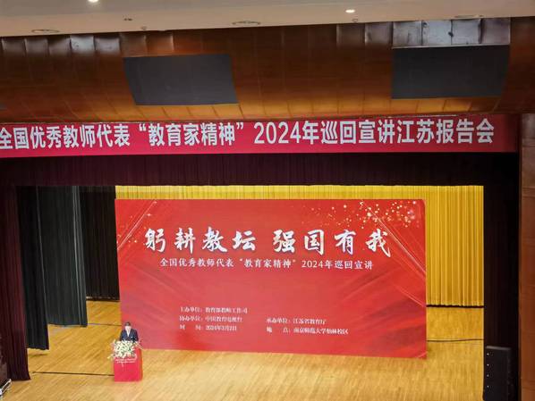 为贯彻落实习近平总书记关于大力弘扬教育家精神的重要指示,营造全社会学习和弘扬教育家精神的良好氛围,3月2日,全国优秀教师代表“教育家精神”2024年巡回宣讲江苏报告会在南京师范大学举行。本次巡回宣讲采用“线上+线下”、“主报告+分报告”的形式举行。我校选派20名教师代表参加现场报告会,组织50名教师代表在校内分会场观看,其余教师通过网络直播共同收听、收看此次宣讲。