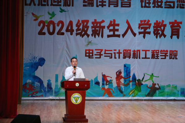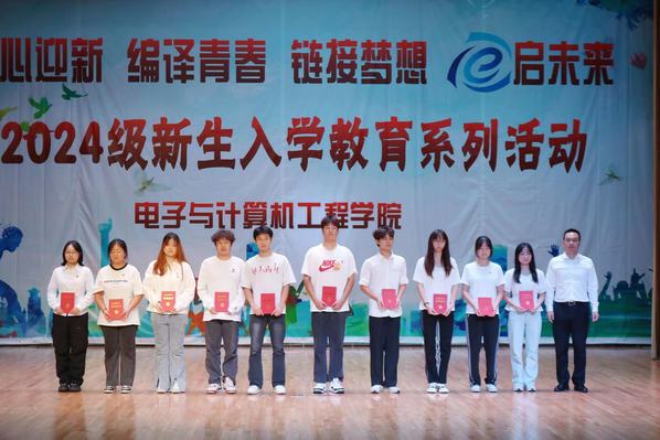 为引导2024级新生全面认识大学、实现角色转换、激发成才动力,电子与计算机工程学院聚焦新生群体特点、把握关键节点、结合专业特色、坚持深耕细作、凝聚育人合力,扎实开展新生入学系列教育活动。9月27日晚,电子与计算机工程学院在综合楼报告厅举办“以心迎新,编译青春,链接梦想,e启未来”新生入学教育系列活动启动仪式,为全院新生顺利开启大学生活奠定良好基础。学院执行院长王晓蔚、党总支副书记羊栋、副院长朱林、新生辅导员、新生班导和全体新生参加了活动,启动仪式由综合办主任冯杭州主持。
