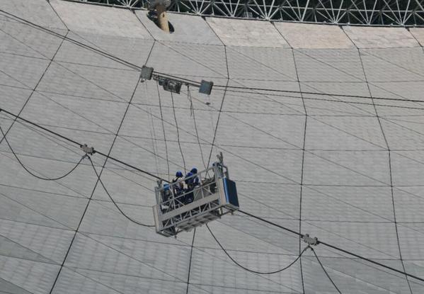 FAST(500米口径球面射电望远镜)是世界上口径最大、灵敏度最高的射电望远镜,由中国科学院国家天文台主导。为了实现望远镜的高精度定位,项目馈源舱采用六索驱动机构,并联牵引30吨重馈源舱在约140米高空和约200米范围内运动,实现馈源舱对天文轨迹的初步跟踪和舱内馈源接收机位姿的初步定位。然而,索驱动钢丝绳、滑车、缆线和牵引绳常年处于高空,人员可及性差,设备检查和维护比较困难,维护工作存在巨大挑战。郭正兴教授和朱明亮副教授团队与国家天文台团队展开紧密合作,为该项目的研发和运营提供持续的技术支持。