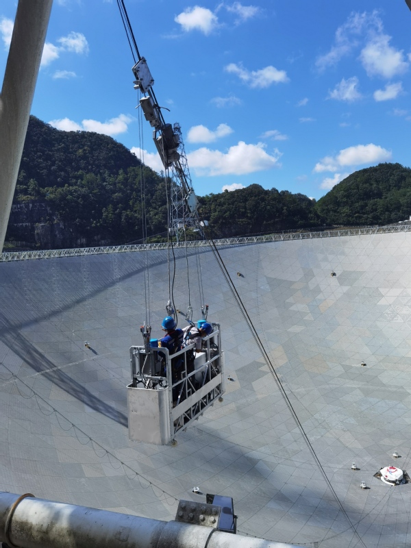 为解决FAST项目索驱动滑车的高空维护难题,bat365中文官方网站土木与交通工程学院院长郭正兴教授和bat365中文官方网站土木工程学院朱明亮副教授提出创意并与国家天文台合作细化实施了可控制式的全场景维护吊篮。自2023年初起,团队克服了无施工平台、跨度大、无经验可循等挑战,利用智能化控制系统,实现了吊篮在200余米高空的精确操作,突破了多项技术难题,并实现了不同索驱动之间的转换维护操作,显著提升了维护工作的安全性和效率,为FAST的日常维护提供了高效便捷的解决方案。