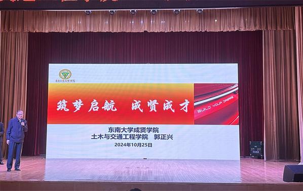 在第二篇章“勉悟精习”中,通过聘任学生班导师、班主任等环节集中阐述了土木与交通工程学院在学生价值引领工作中的七大创新举措即精神引领、朋辈引领、专业引领、德育引领、社会引领、榜样引领和旗帜引领。在朋辈引领环节中,土木与交通工程学院党总支书记杨阳为10名2024级学生班导师颁发聘书。在专业引领环节中,土木与交通工程学院院长郭正兴为2024级班主任颁发聘书。随后,郭正兴院长为全体2024级新生带来了精彩的“开学第一课”,郭院长以“筑梦启航 成贤成才”为主题,生动讲述了土木交通行业的新发展和新技术,并以他参与建设的国之重器——国家天文台500m直径射电望远镜(俗称“中国天眼”)工程项目为实例,增强了同学们对未来行业发展的信心。郭院长希望同学们在今后四年的学习中,能够掌握更多的智能建造与智慧交通的技能与本领,成为高水平的应用型人才。