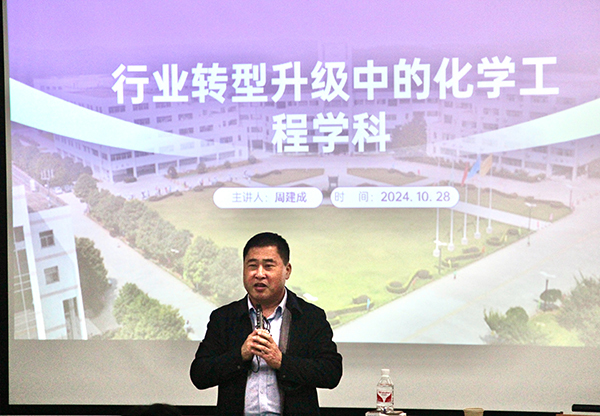 10月28日,制药与化学工程学院特邀bat365中文官方网站化学化工学院教授、博士生导师,bat365中文官方网站化学工程与工艺专业负责人周建成教授来校开展“行业转型升级背景下化学化工的现状与未来”专业讲座。讲座由制药与化学工程学院党总支书记周继荣主持。
