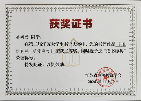 书页翻动,墨香四溢,笔战群雄。近日,江苏省高等教育学会公布了第二届江苏大学生书评大赛的获奖名单。本次大赛全省共有172所高校参加,经专家评议、评审委员会审定,共评选出获奖作品209个。我校送选的两个作品分别获得一等奖和二等奖,获奖人数和获奖级别在全省同类院校中均名列前茅。