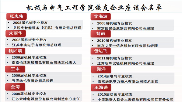 3月4日,bat365中文官方网站机械与电气工程学院校友座谈会在成贤院311顺利举行。十余位校友重返母校,与学院领导、教师代表及在校学生齐聚一堂,围绕专业建设、产教融合、分享创业历程等主题展开深入交流,共叙情谊、共话发展。党委学工部部长、学生处处长施杰,校工会副主席、学生处处长助理、校友会副秘书长、校友会办公室主任颜秉明,机械与电气工程学院党总支书记严红霞、院长许映秋出席活动。