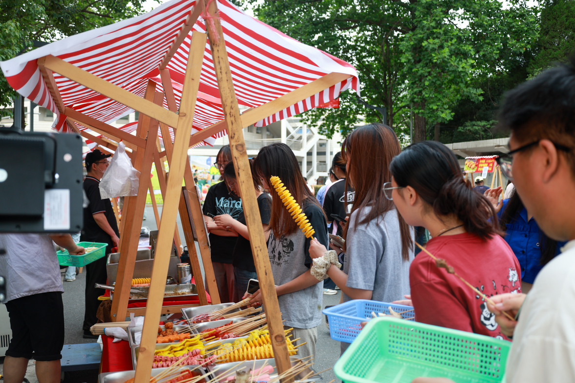 活动现场的另一侧,美食节化作一片诱人的烟火人间。我校食堂特别准备了龙虾、烧烤等拿手好菜,满足着来自五湖四海的味蕾。金黄酥脆的炸串香气四溢,清爽甘甜的各色水果沁人心脾,琳琅满目的地方小吃与网红美食汇聚一堂,构成了一场视觉与味觉的双重盛宴。同学们穿梭于熙攘的摊位间,挑选心仪的美食,与好友共享这舌尖上的愉悦。每一口滋味,都饱含着对校园生活的热爱与对同窗的祝福。