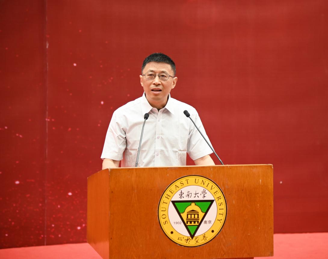 机械与电气工程学院电力1班丁晗校同学代表毕业生向学校、老师和家长表达感谢和敬意,并以诗句“追风赶月莫停留,平芜尽处是春山”与大家共勉,勉励大家勇担重任,让青春在全面建设社会主义现代化国家的火热实践中绽放光芒。
