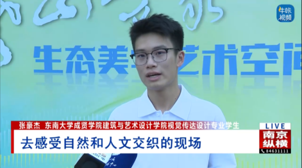此次“老山万象”生态美学艺术空间发布活动受到人民网、扬子晚报、江苏经济网等多家主流媒体关注报道。我院22视觉传达1班张豪杰作为高校学生代表接受了南京电视台新闻综合频道、江苏城市频道《零距离》栏目采访,分享了参与活动的感受以及对艺术赋能乡村的理解,展现成贤学子良好的专业素养与社会参与意识,进一步扩大了学院在地方文旅融合发展中的影响力。
