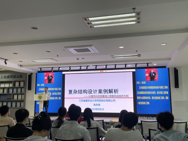 讲座中,张总工以“理论结合实践” 为核心,将自身多年的工程经验与前沿设计理念融入分享。他以南京 AI 总部基地三塔复杂连接体项目为核心案例,用生动的工程实例、清晰的逻辑分析,为师生们揭开了复杂结构设计的 “神秘面纱”。他指出:“所有看似复杂的结构工程,究其本质,都是基础技术的有机耦合与创新应用。” 针对南京 AI 总部基地这一典型的多塔连体超限高层建筑项目,张总深入剖析了项目设计中的核心难点与突破思路,强调 “以最少的技术变量实现最高的功能密度” 是此类项目成功落地的关键,而这一过程正是对结构工程师专业素养、创新思维与工程把控能力的综合考验。他通过项目设计中的具体细节,从结构体系选型到关键节点优化,从荷载分析到抗震性能提升,向师生们展示了如何通过合理组合、 灵活运用基础技术,破解复杂工程难题,确保项目安全、高效推进。