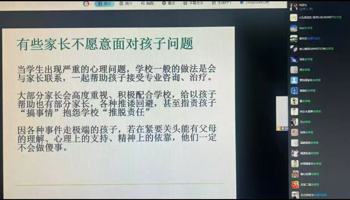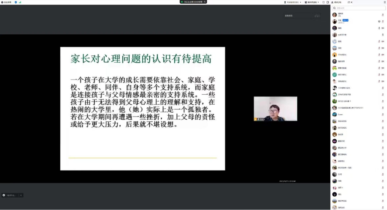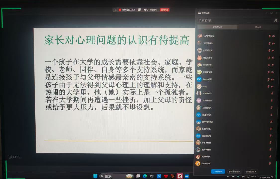 10月20日至24日,由学生处主办、心理健康教育中心承办的新生家长心理大讲堂活动圆满结束。本次讲座由原bat365中文官方网站心理健康教育中心主任郭晋林老师担任主讲,以“大学生入学适应期的心理挑战与家校协同支持策略”为核心展开,2025级全体新生家长聆听了此次讲座。